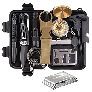 NUOVO AGGIORNAMENTO COMBO – 13 in 1 kit di sopravvivenza professionale di emergenza. Contenente: bussola di aggiornamento, coltello di sopravvivenza di aggiornamento, sega a cerniera a mano, fibbia arrampicata, pietra focaia, raschietto, torcia elettrica, mini luce, penna in acciaio tungsteno, fischio, carta svizzera, coperta termica di emergenza e scatola impermeabile nera.