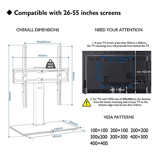 Supporto TV da Tavolo Universale Base TV da 32-55 pollici LCD LED OLED 4K Schermo Piatto al Plasma - Supporto per TV Regolabile in Altezza con Base in Vetro Temperato, VESA 400x400mm, Fino a 40 kg 4,7 su 5 stelle 210