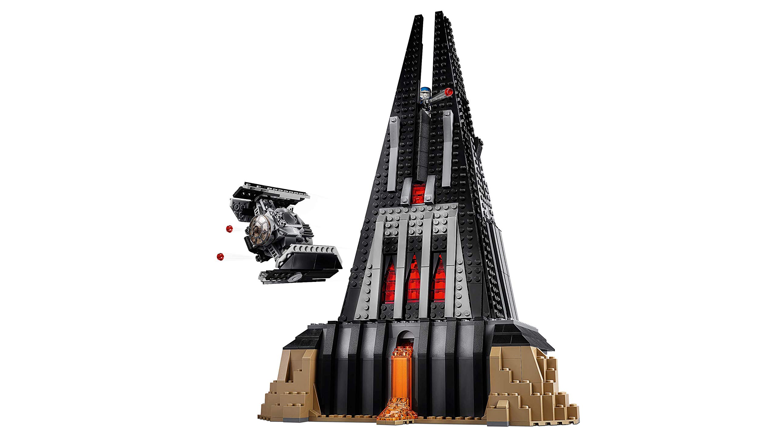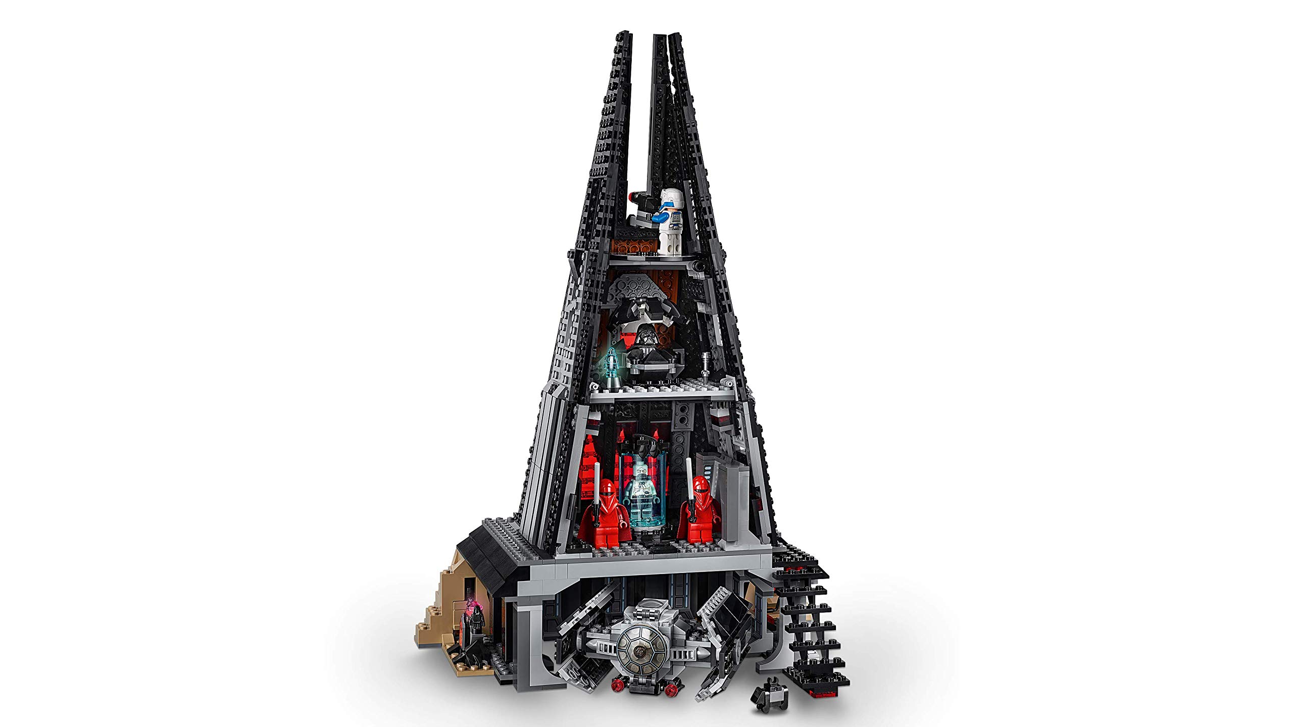 Il castello contiene anche una porta di accesso laterale, una vasca di bacta aperta, un gancio per il mantello di Lord Vader, una camera di meditazione con spazio per una minifigure e un’unità di comunicazione olografica, oltre a un’area per i meeting circolare nella parte superiore con un cannone di difesa