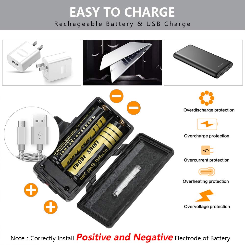【USB ricaricabile】 Viene fornito con 2 pezzi di batterie 18650 da 3200 mAh ad alta capacità. Con il cavo USB puoi caricare facilmente i fari: rosso / ricarico, verde / completamente carico. Prima di utilizzare REEXBON lampada da testa , vi preghiamo di caricare completamente la batteria fino a quando la luce verde è accesa. Prestare attenzione ai terminali positivo e negativo della batteria per assicurarsi che la batteria sia installata correttamente (se la batteria è installata nella direzione.