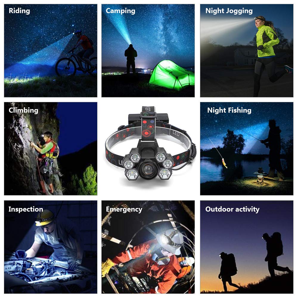 TORCIA LAMPADA FRONTALE T6 9 LED USB RICARICABILE 10000LM. 1 9x T6 faro. Facile da gestire con l'ambiente duro in natura. Modalità di ricarica: interfaccia Micro USB. 1 Cavo micro USB. 2 18650 Batteria.