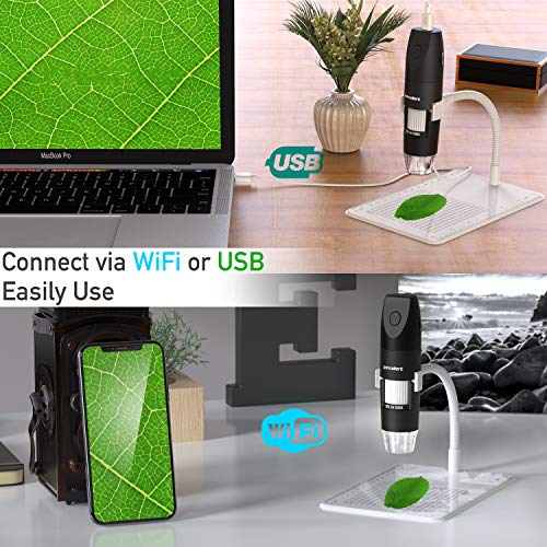 【WiFi & USB MICROSCOPE】--DINGUIER Wireless Digital Microscope for Kids can be connected with your device via WiFi or included USB cable. Equipped with 360 degree rotatable metal stand and fixed base, you can put this portable handheld digital zoom microscope in your pocket and go to everywhere to explore microworld.