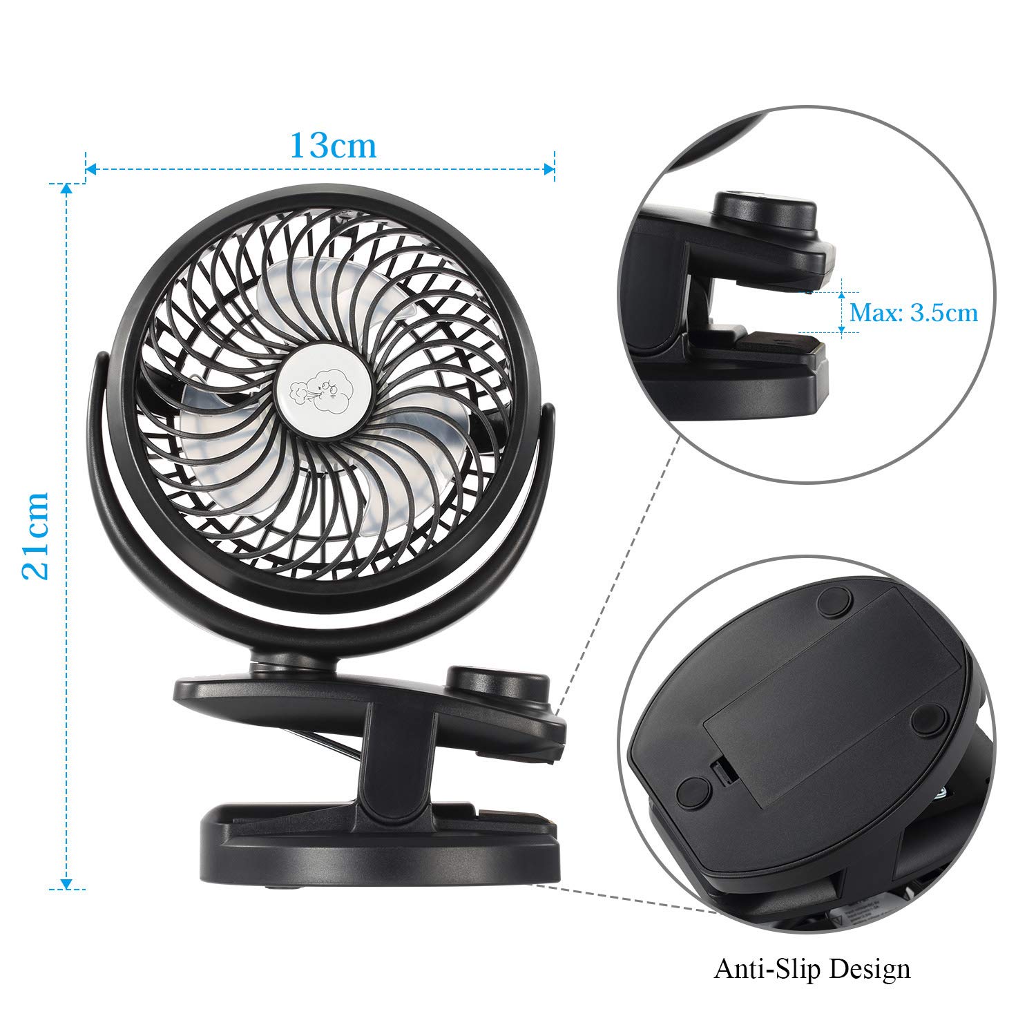 ✤ 【OSCILLAZIONE AUTOMATICO E CLIP DESIGN】 La ventola del desktop mini USB può essere ruotata di 360° e oscillazione automatico di 90°. Il ventilatore a clip può essere fissato al passeggino o posizionato direttamente sul tavolo, a casa o in ufficio.