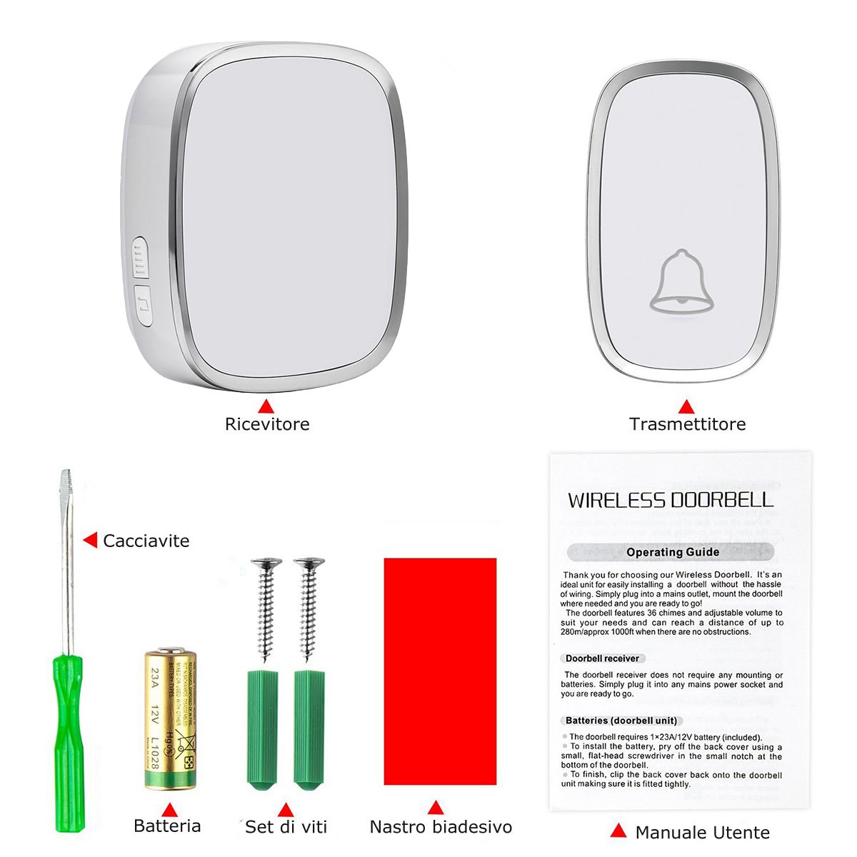 INDICATORE LED: Il campanello (trasmettitore) e ricevitori hanno indicatori LED, se qualcuno spinge il campanello, i tre dispositivi lampeggiano tutti con luce blu. 36 suonerie disponibile, 4 volume regolabile da 25 dB a 85 dB.