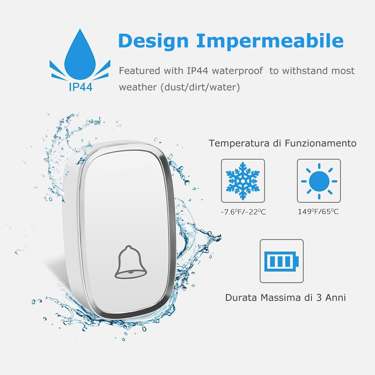 OTTIMA QUALITÀ & IMPERMEABILE IP44: Questo campanello è fatto di materiale ABS, non tossico e innocuo. Il trasmettitore è IP44 impermeabile e accettabili per uso esterno. Si mantiene contro polvere, pioggia e alta temperatura. Nessuna radiazione elettromagnetica. CE certificato.